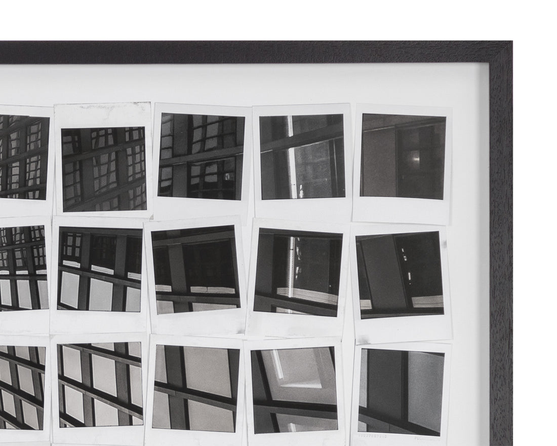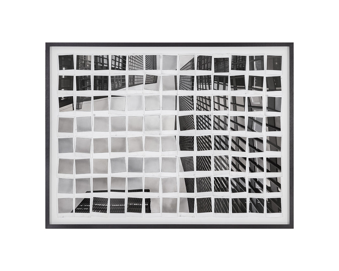 A series of black and white printed polaroid pictures come together to create an urban landscape. This contemporary piece recreates the feeling of awe when looking up at tall buildings in a busy city. Features a solid black wood frame.