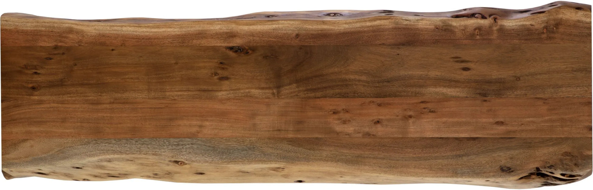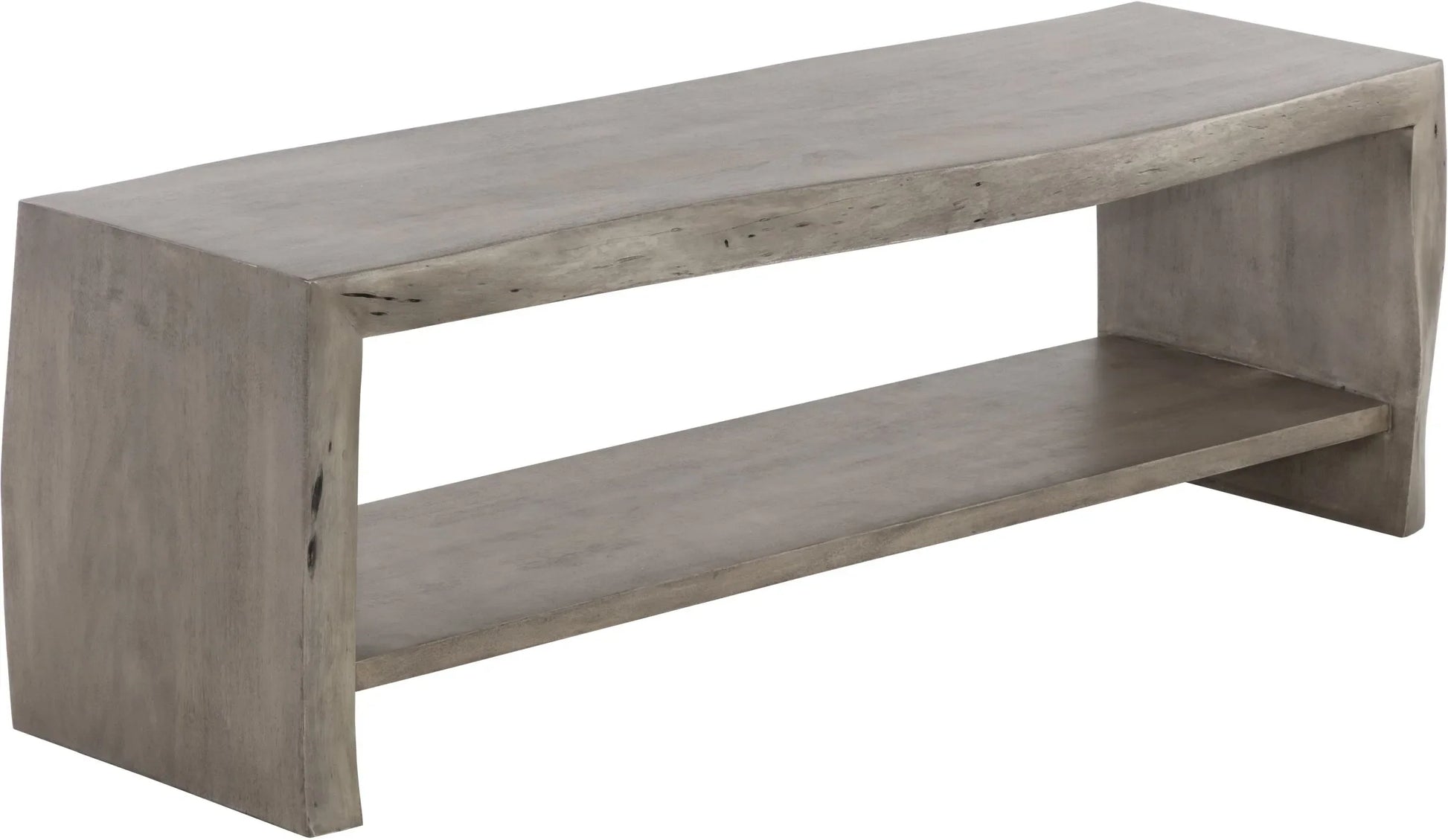 Introduce a sense of nature to any foyer or living space with this captivating live edge bench that features a stunning waterfall edge design. Crafted from solid grey acacia wood with a bottom shelf for added functionality. Also available in natural acacia wood. As wood is an organic, porous material, these pieces will contain natural variation of texture and may also exhibit fine indentations and cracks. Wood pieces will also display a disparity of colour and grain, and visible knots and burls that add to the character of each piece.