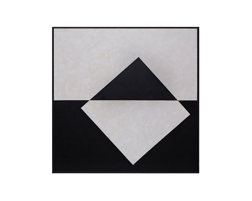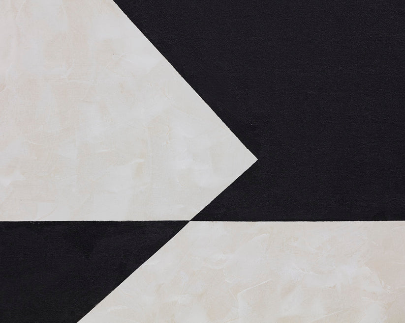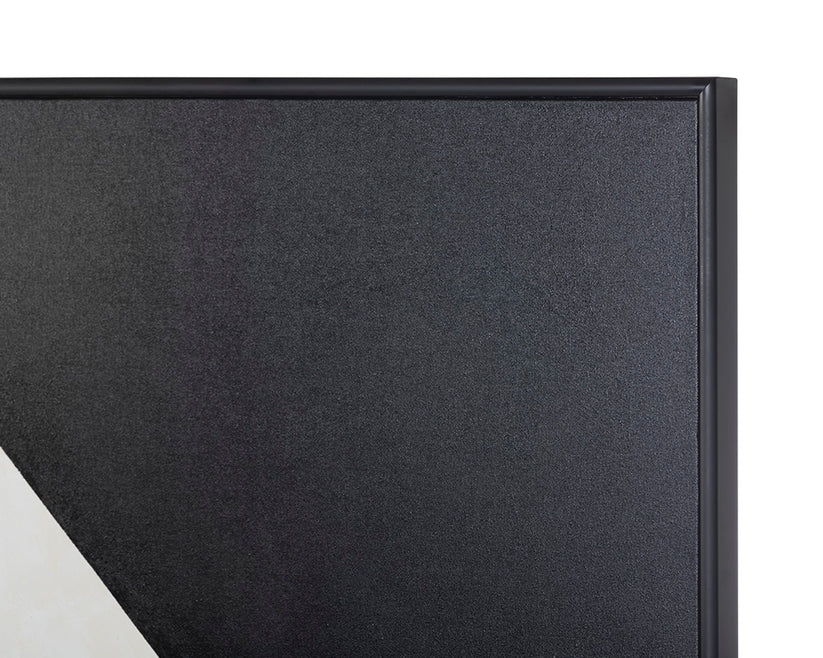 This modern painting of black and white geometric shapes evokes a sense of visual movement. Features a black finished wood floater frame.