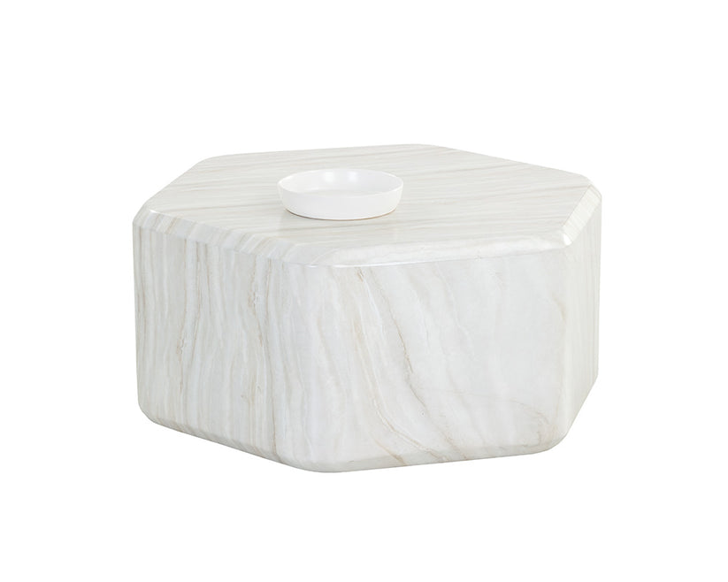 Introduce shape to any space with this stunning hexagon coffee table. Crafted from cream concrete with a marble-look finish. Coordinating high side table in white and low side table in grey marble-look also available.