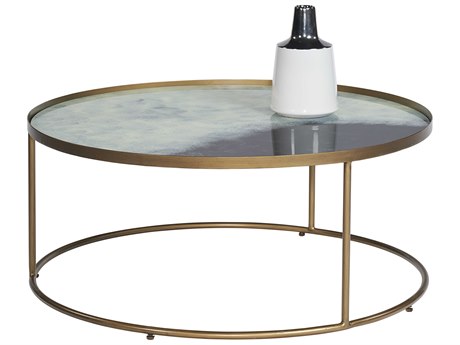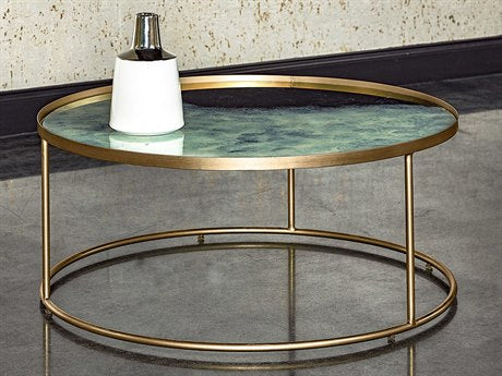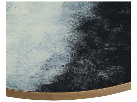 Channeling a celestial inspired design, this mesmerizing coffee table features a unique shape that will add interest to any space. Features a glass top with a hand painted vellum look. Completed with a metal frame in an antique brass finish. Pairs well with the Thalia nesting tables.