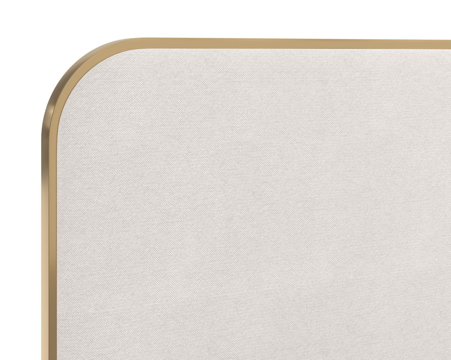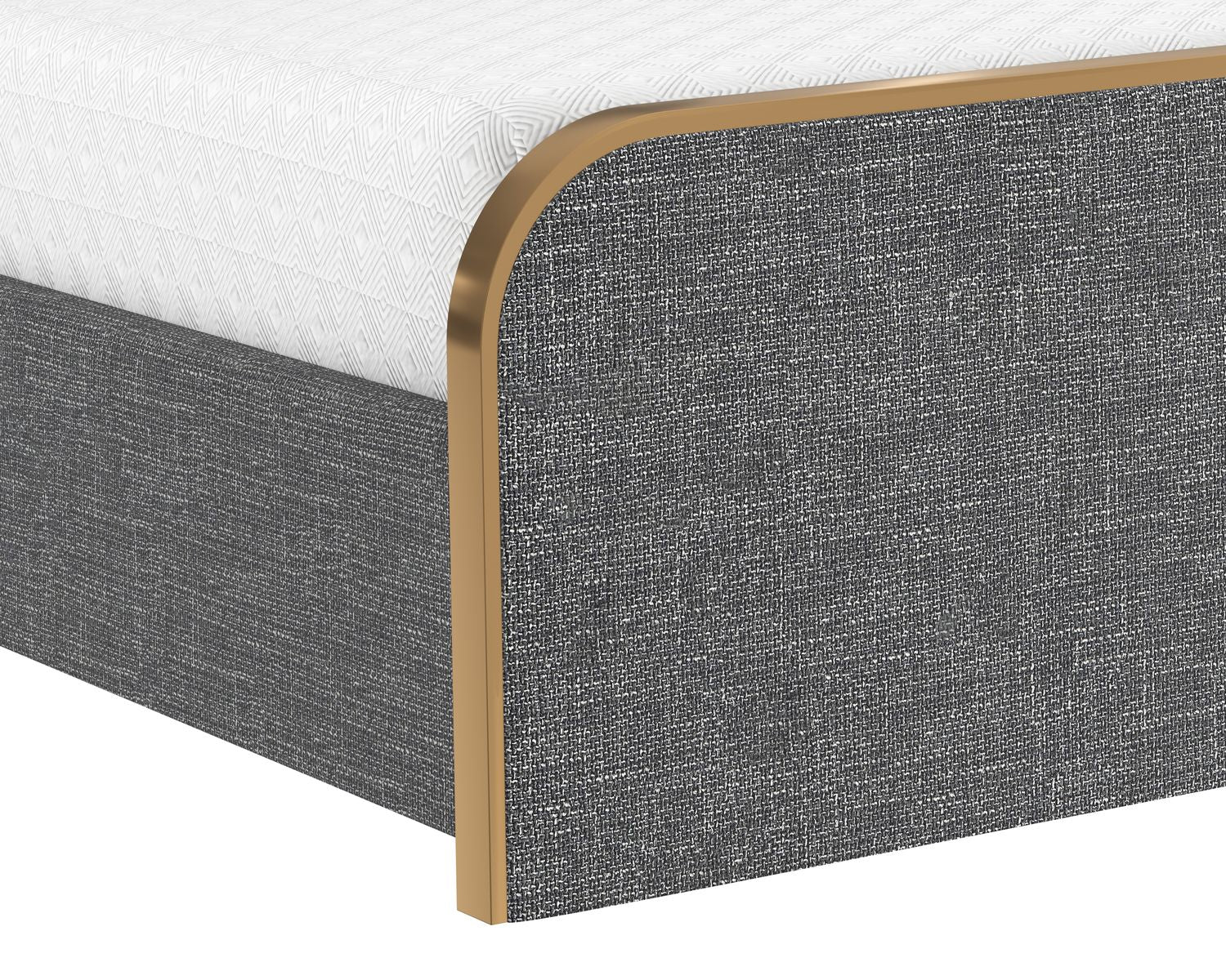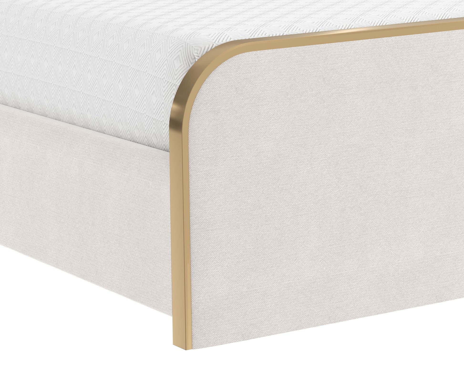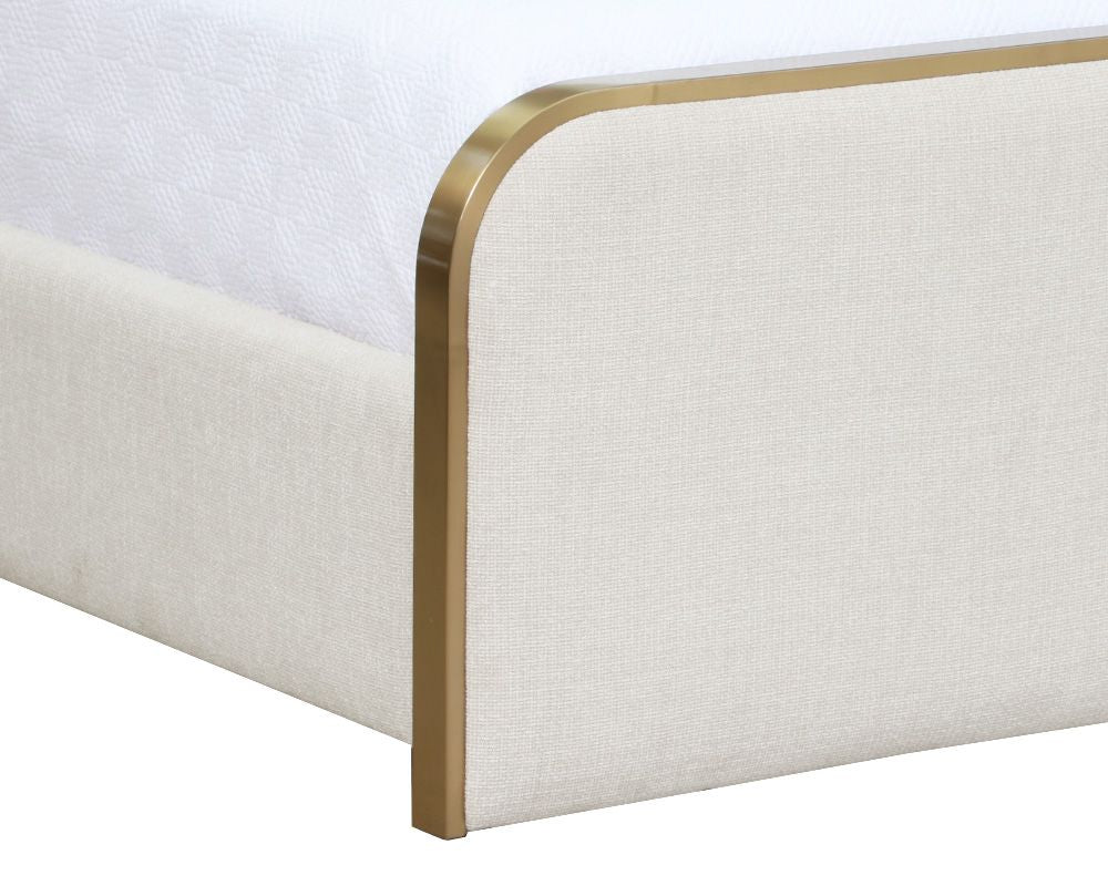 Effortlessly sleek and modern, this bed is a brilliant addition to any bedroom space. Features a gently curved headboard and footboard upholstered in chacha cream and grey fabrics with a stainless steel border in a brushed gold finish. No box spring is required and slats are included.