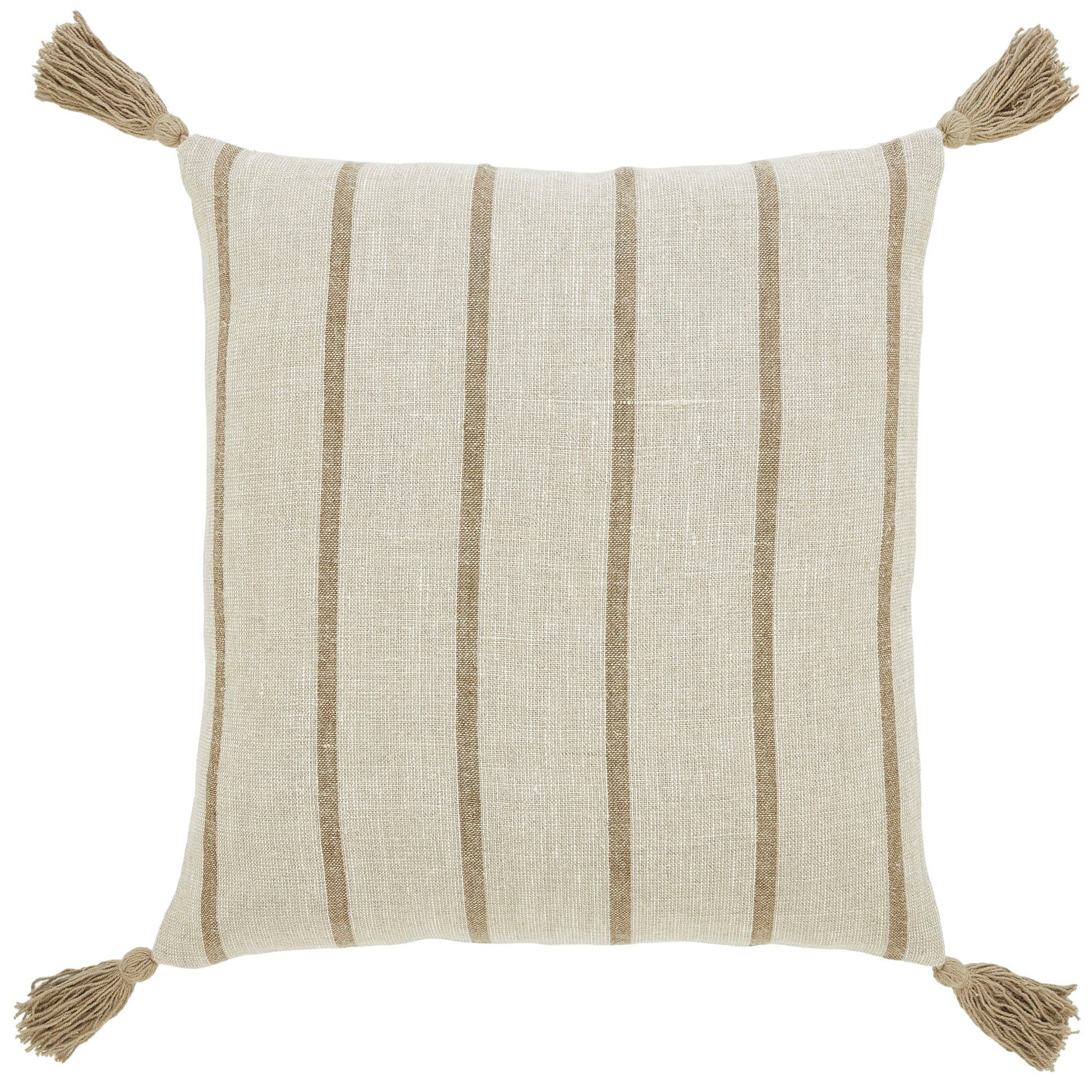 Tassels and stripes take this natural brown throw pillow design to the next level and infuse any interior it enters with charm. Thanks to its versatile square size, this decorative pillow can be placed alone on a seat or bed or arranged with other pillows of differing sizes. This pillow’s 100% linen structure and down/feather filling makes it not only comfortable to rest upon but allows it to maintain its shape over time.