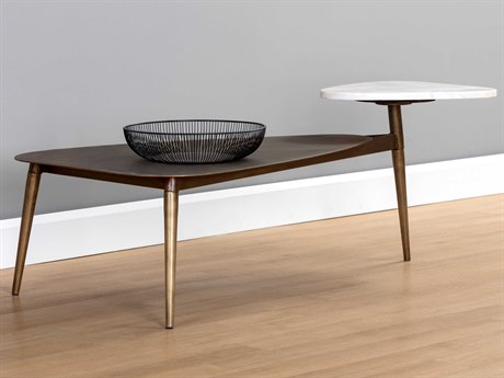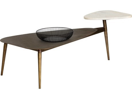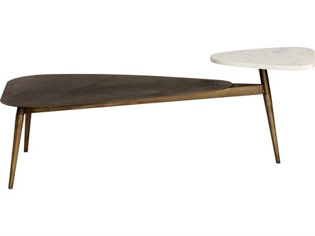 A unique coffee table crafted with mixed materials and organic shapes. Features a hand-etched antique brass iron top and legs with a white marble shelf. Made in India: With refined craftsmanship, this design was brought to life by skilled local artisans. By nature, these materials develop unique imperfections such as fissures, markings and colour variations for a truly one-of-a-kind piece. As marble is a natural material, unique veining, pitting, fissures, micro-cracks and colour variations are all characteristics that add to the uniqueness and beauty of each piece.