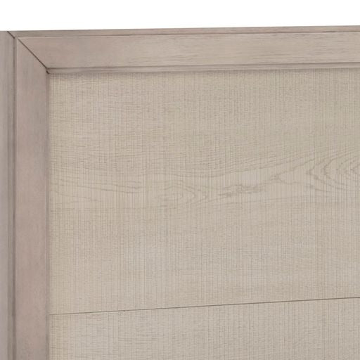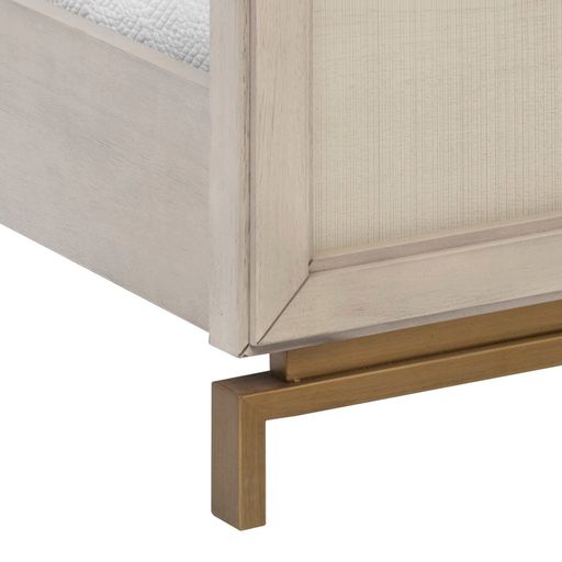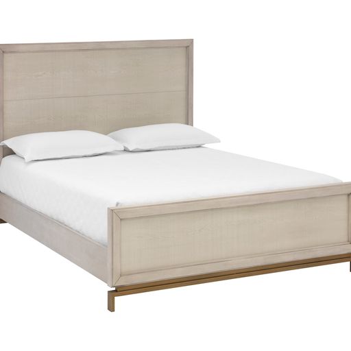 This sophisticated bed will bring a sense of luxury to any resting space. The modern frame is crafted with eucalyptus wood veneer and contrasted by an oak wood veneer headboard and footboard featuring a saw cut texture. Brass steel hardware completes the look. No box is spring required and slats are included. Coordinating nightstand, dresser, sideboard, display cabinet and chest also available.