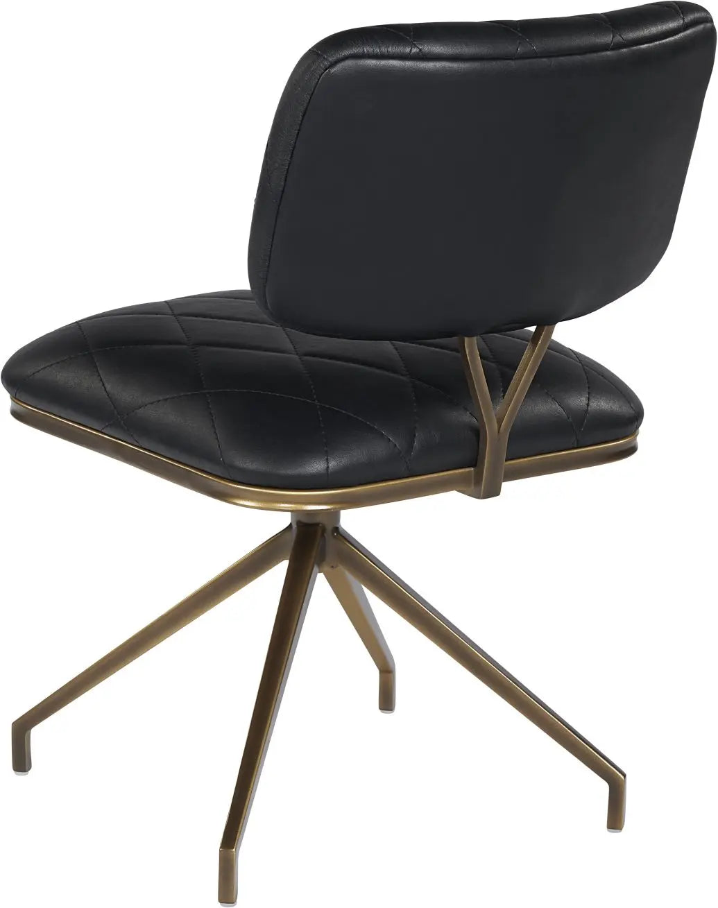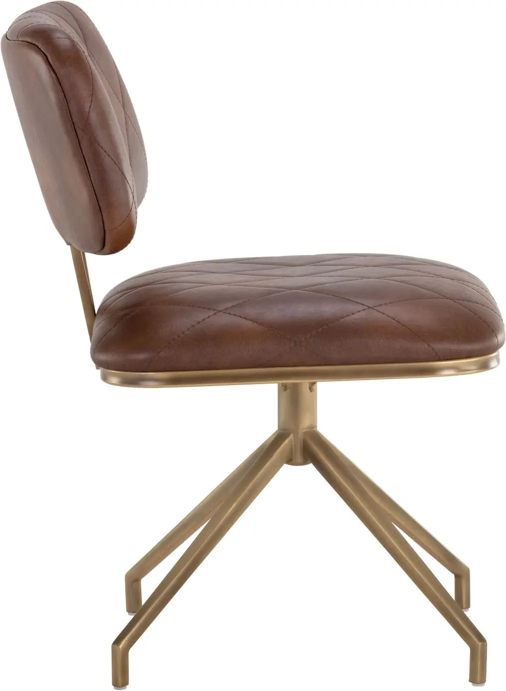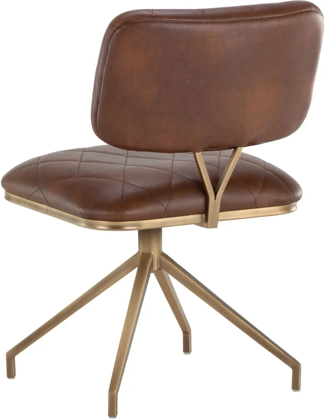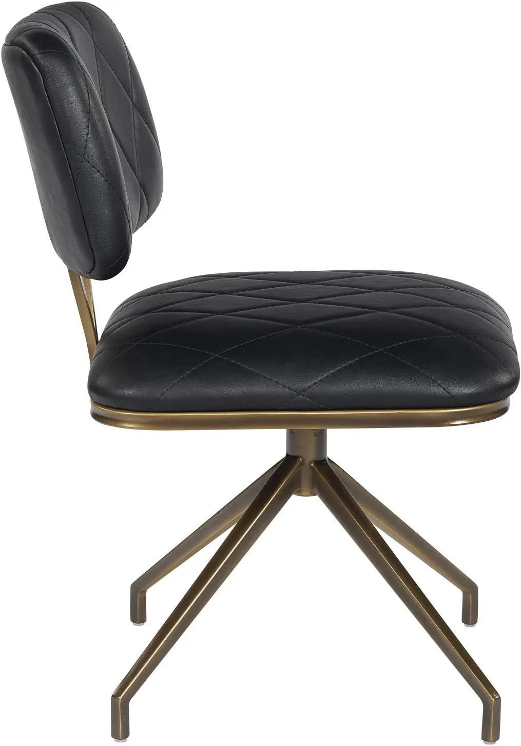 A sweet, compact swivel dining chair perfect for living, dining, lounge and small environments. Features diamond tufting on the seatback and a rustic bronze frame. Stocked in bravo black, cognac and cream faux leather. Handle With Care: This design has been crafted with faux leather. Faux leather is manufactured to reflect the natural characteristics of leather; as such, colour variations, markings, wrinkles, grooves, and light scratches are appreciated characteristics. No two pieces will be alike. Visit our Product Care page for more information on how to ensure the lasting beauty of this piece.