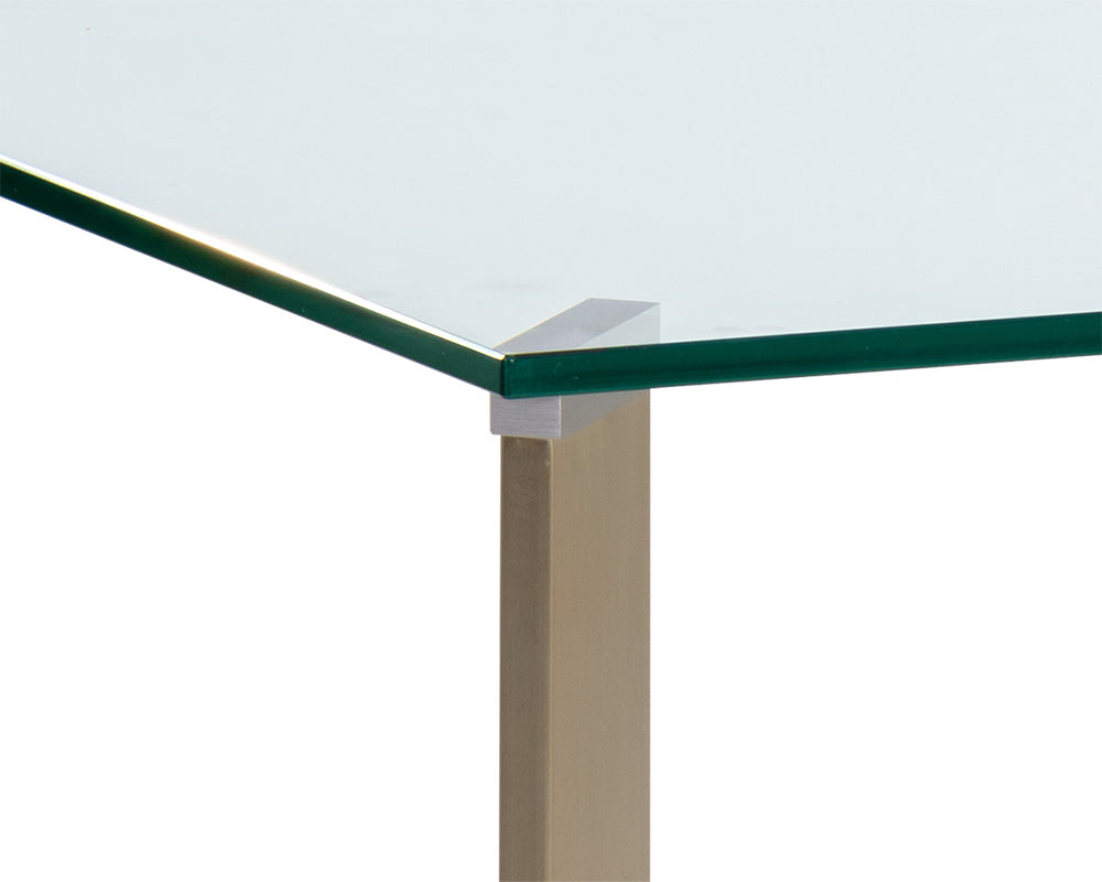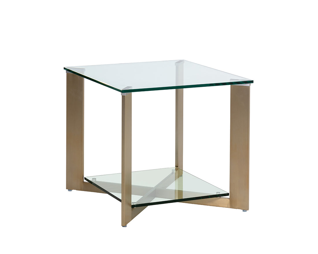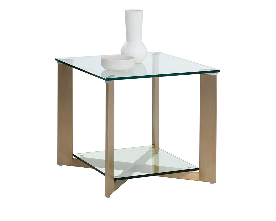 A sleek and modern square end table. Made with a tempered glass top and bottom shelf perfect for displaying decor and accents. Finished with an antique brass stainless steel frame. Coordinating coffee table in rectangle and square shapes also available.
