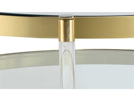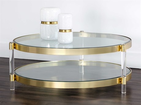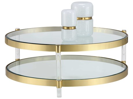 This glamorous coffee table is a showstopper. Featuring a tubular lucite frame and tempered glass top and bottom shelves. A stainless steel or brass frame completes the design. Perfect for living and lounge spaces in residential and contract environments.