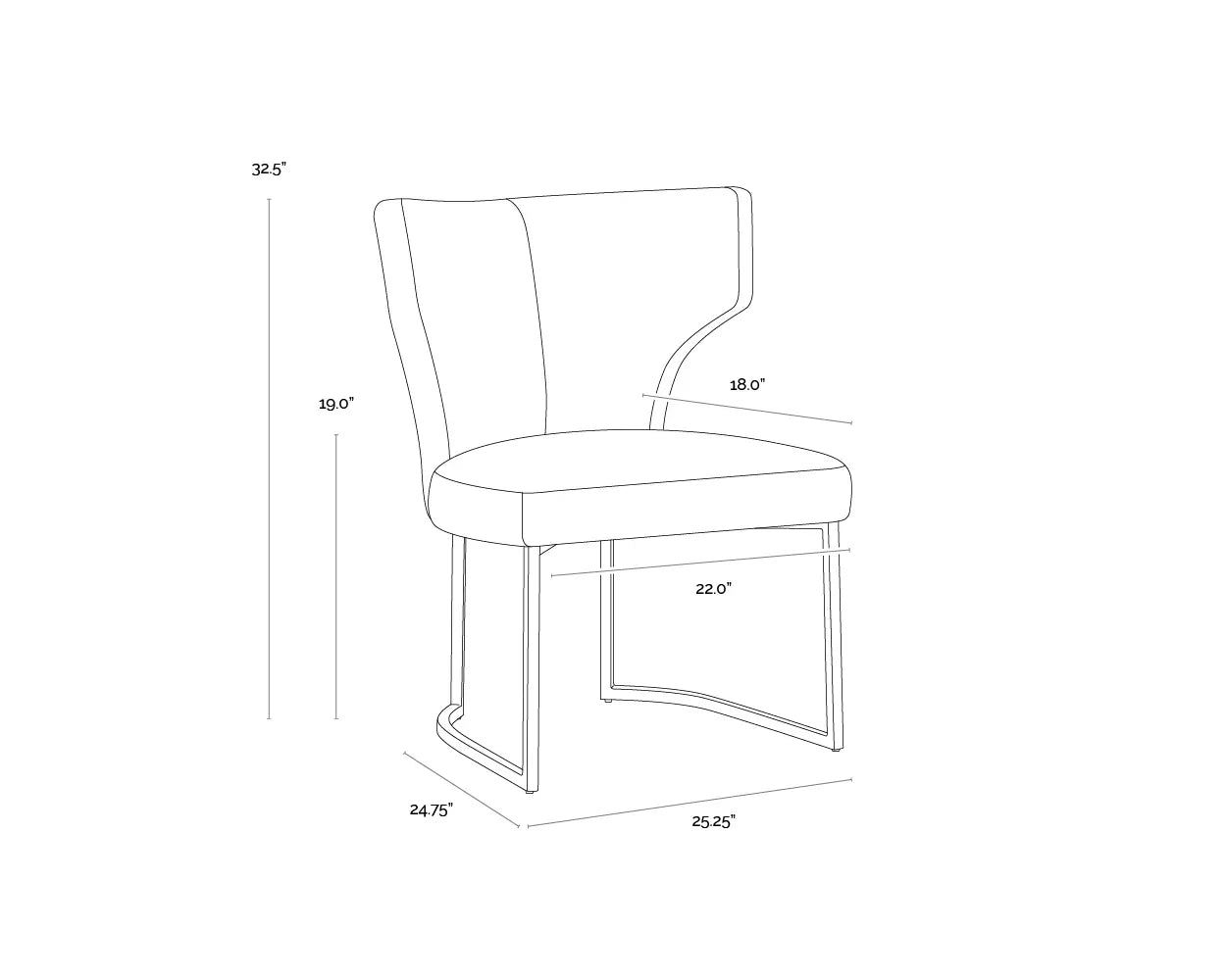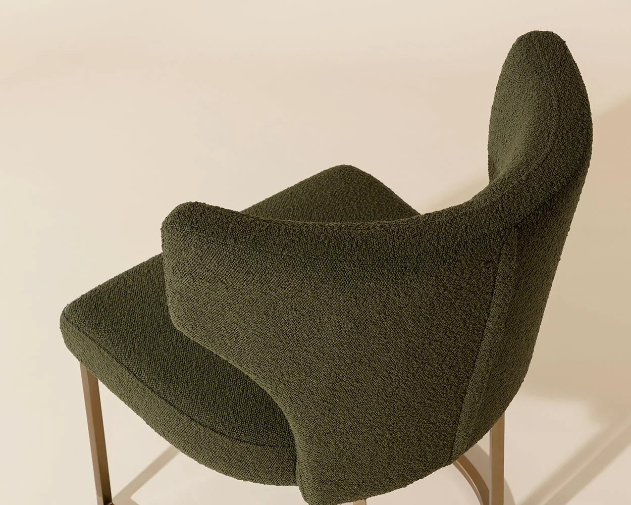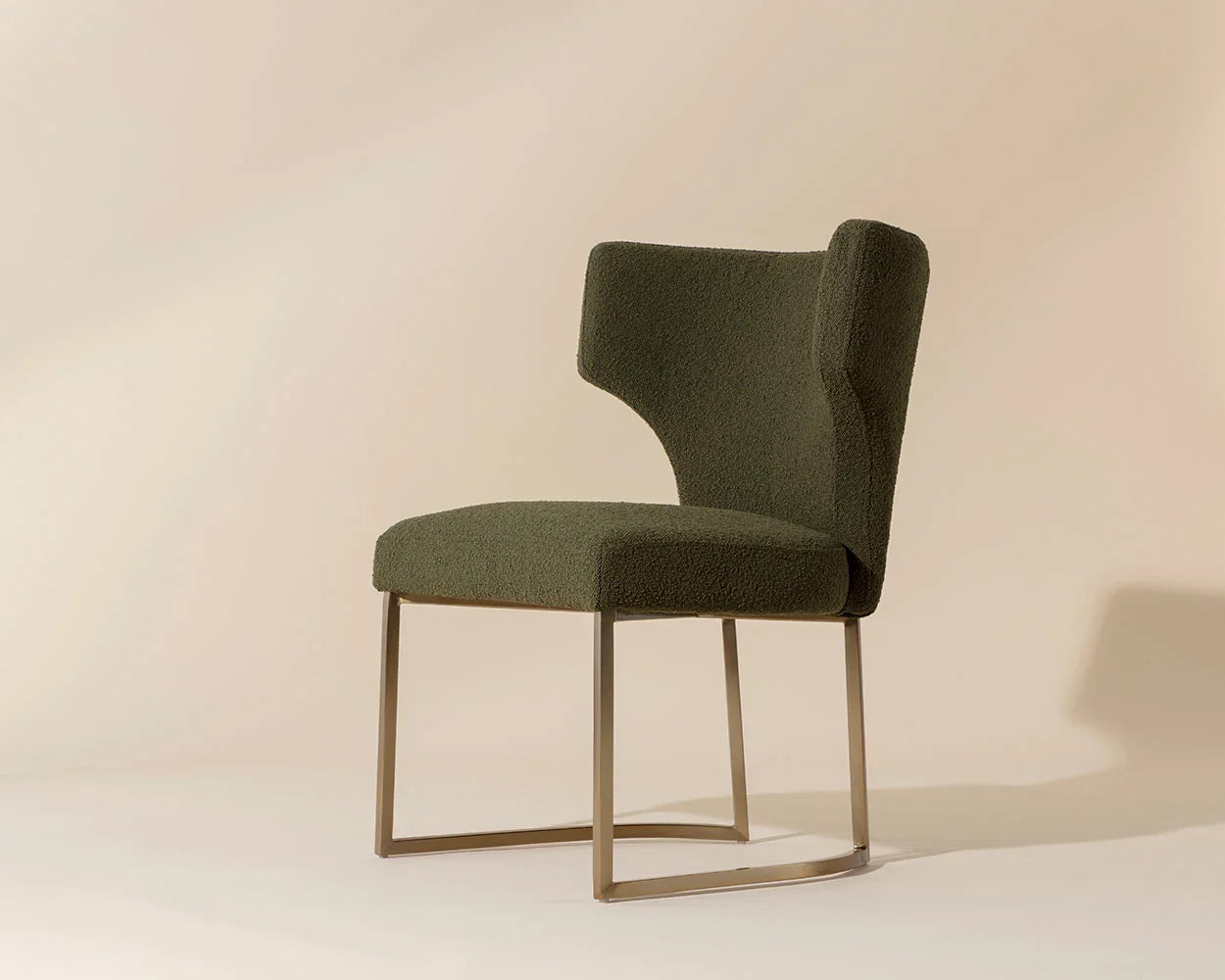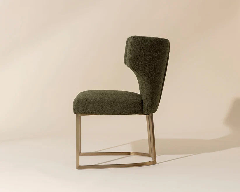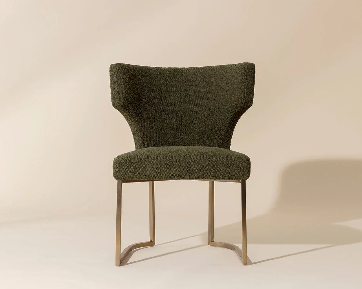 This unique take on a wingback dining chair is elegant and stylish. Curved antique brass steel legs create additional glamour.