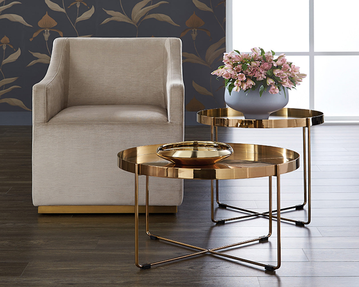 An eye-catching, ultra glamourous wheeled lounge chair. Stocked in our abbington black fabric with a brushed brass steel frame. Sophistication and comfort fit for various dining and lounge spaces.