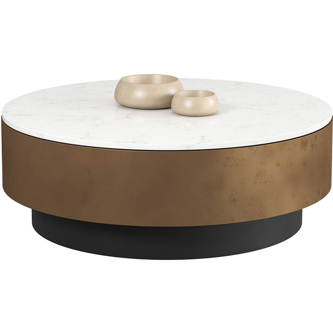 Exuding pure opulence, this splendid coffee table is designed to be noticed. Features a white marble top with a steel base in antique brass and black. As marble is a natural material, unique veining, pitting, fissures, micro-cracks and colour variations are all characteristics that add to the uniqueness and beauty of each piece.
